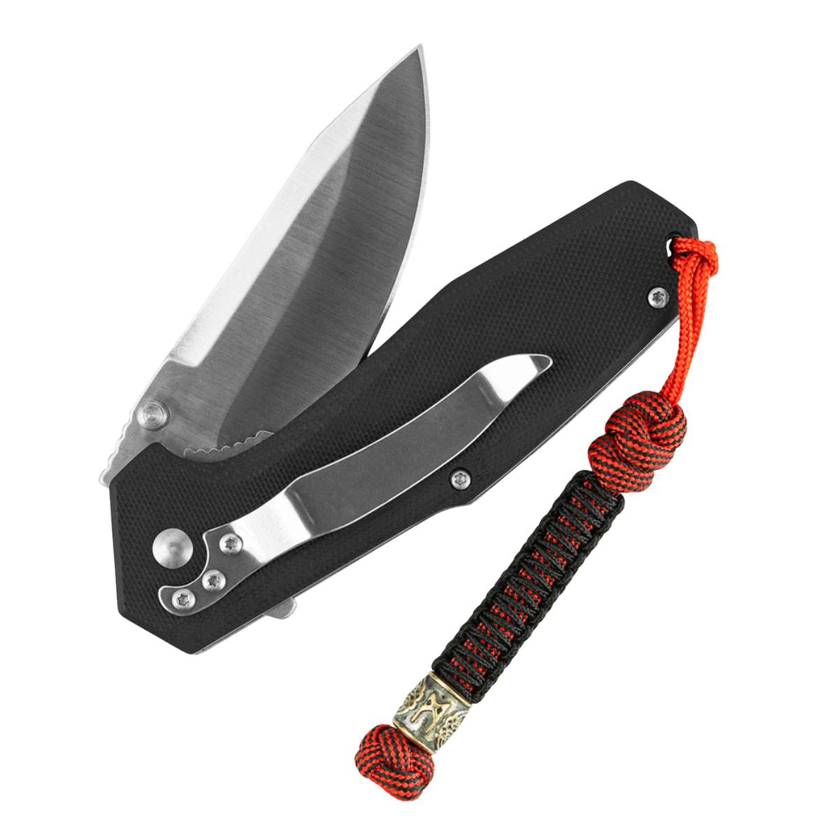 Den gjør det lettere å ta en kniv opp av lommen eller finne den blant utstyret. En dekorativ perle med skandinaviske motiver gir et spesielt preg.