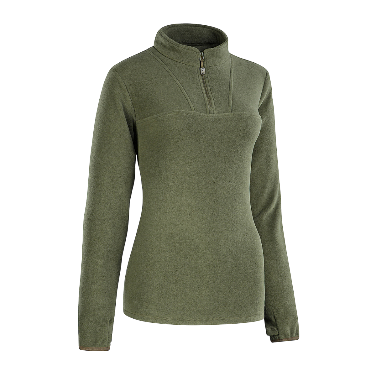 Detaljer: Halv lynlås, høj krave, feminin pasform, slidstærk konstruktion