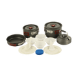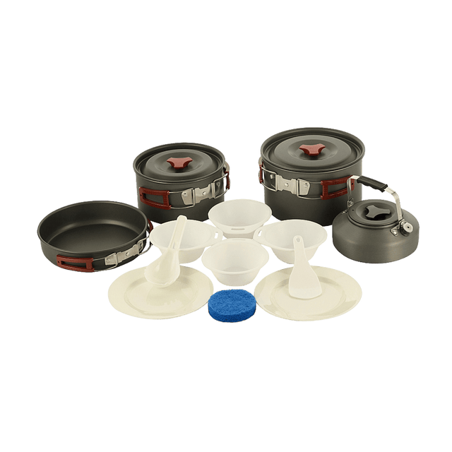 Sættet indeholder alt, hvad du behøver til madlavning i felten – gryder, pande, kedel, tallerkener, skåle, serveringsredskaber og svamp til rengøring. De varmebestandige håndtag beskytter mod forbrændinger, og alt kan pakkes sammen i den medfølgende netpose med bærestrop for nem transport.
