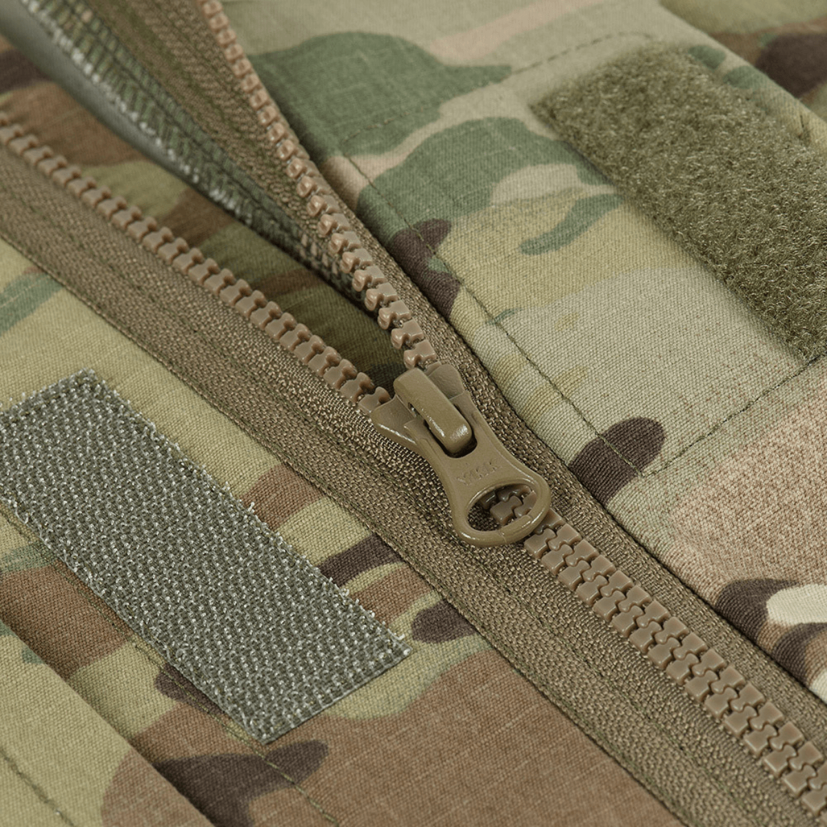 Den lukkes med en sentral glidelås dekket av en borrelåsstropp. Det er to skjulte borrelåslommer på brystet med vertikale åpninger for enkel tilgang til innholdet. Ermene har også romslige lommer med klaffer for ekstra oppbevaring. Borrelåspanelene på bryst og ermer er designet for å feste navneskilt og merker. Mansjettene kan justeres med borrelås.