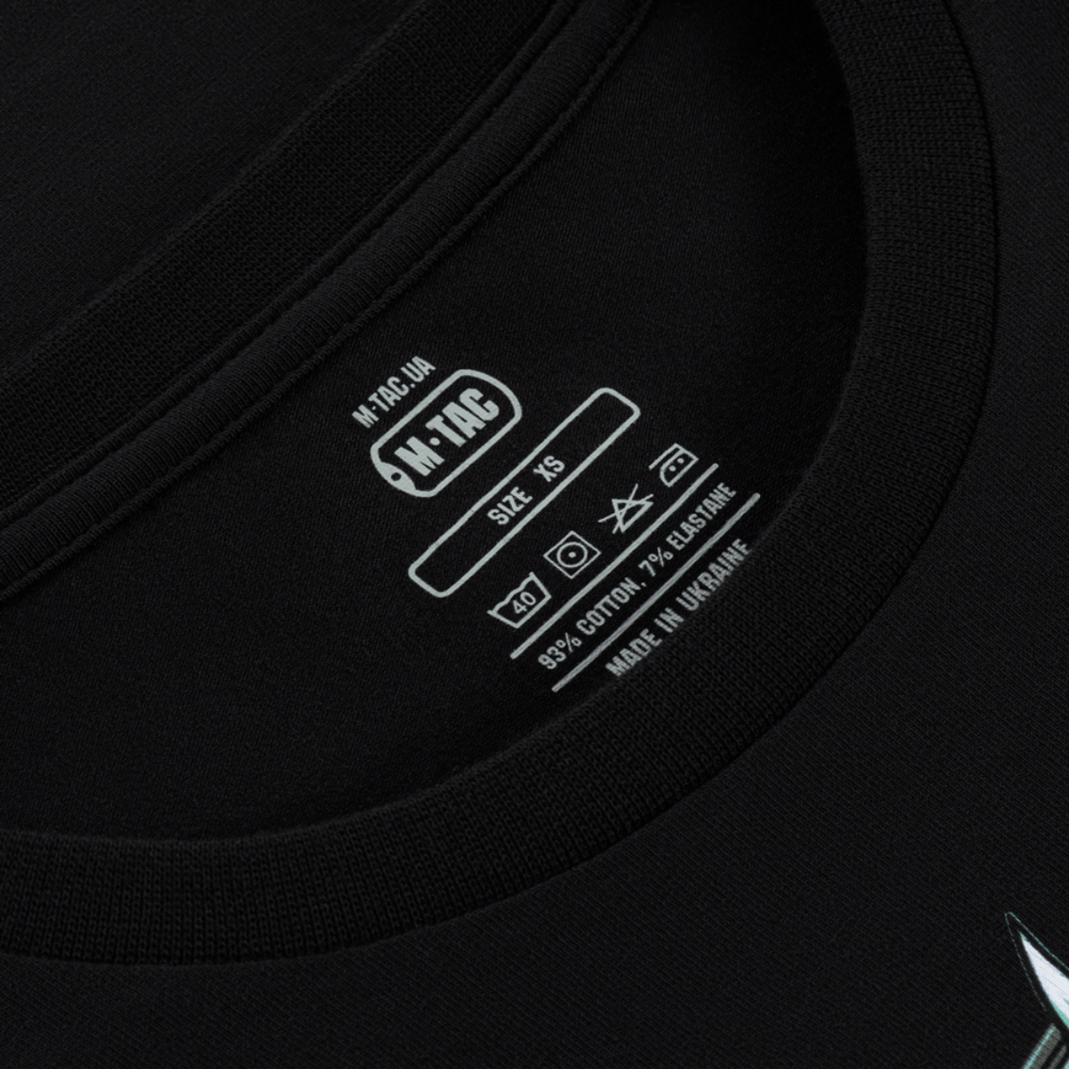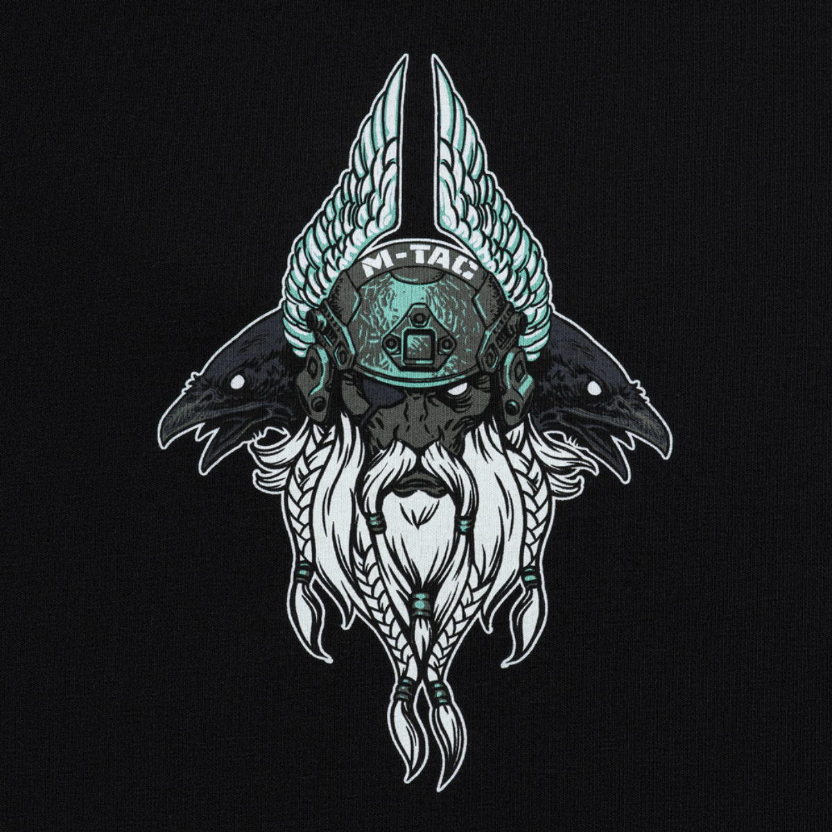 M-Tac T-Shirt Odin Mystery Long Sleeve fortsætter serien med den øverste gud i skandinavisk mytologi. Printet viser Odin med AR-15, iført moderne kampudstyr og NVD-hjelm, klar til den endelige kamp. På hans skuldre sidder ravnene Hugin og Munin, og teksten "Valhalla Calling" refererer til vikingernes legendariske kampråb.