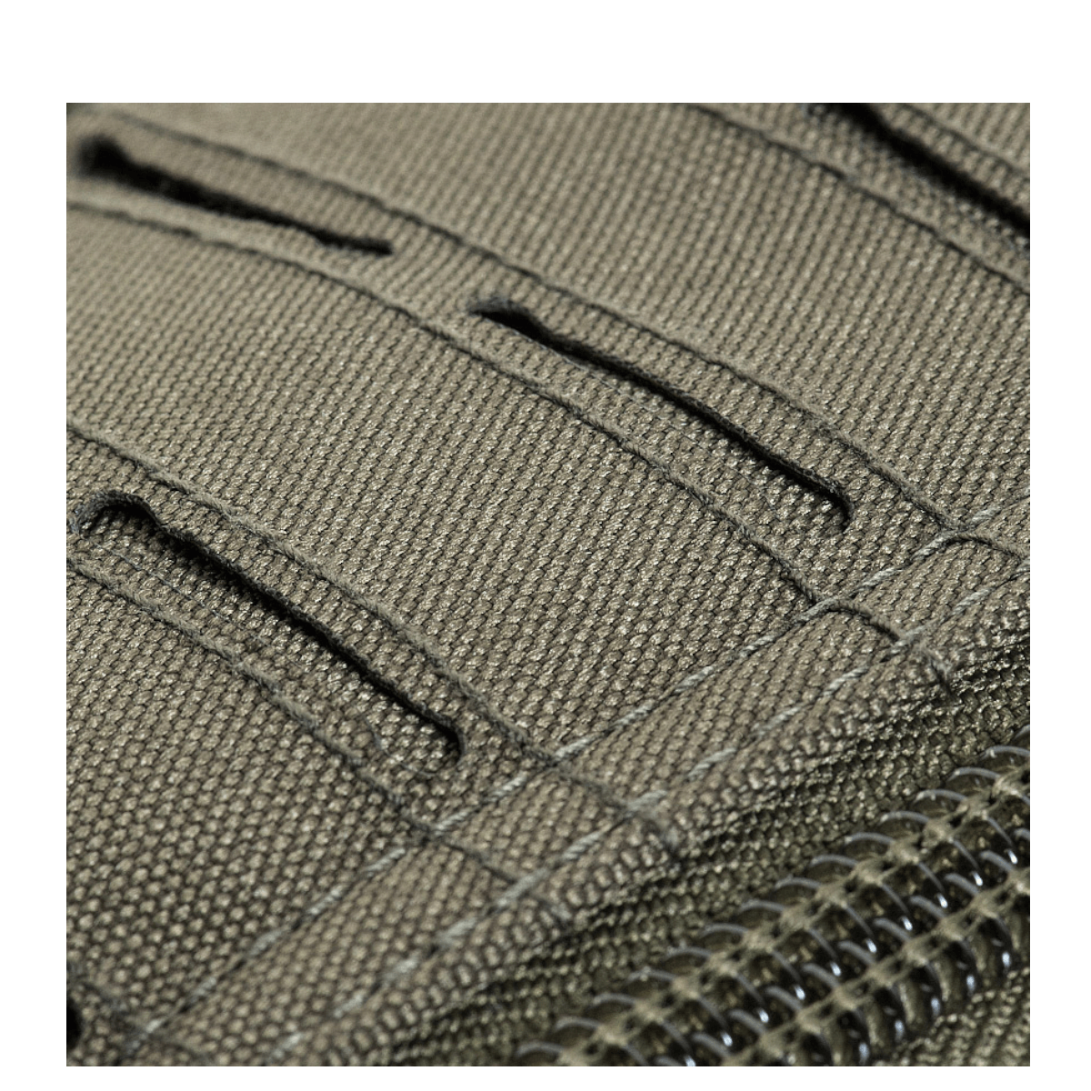 På rygsiden er der en stor lomme med aktivt ventilerende membran. M-Tac-specialister har anvendt en ny teknologi til fastgørelse af modulære lommer. I stedet for de sædvanlige PALS-remme er der laserskåret flere rækker af specielle huller i nylonlaget, hvilket gør det muligt at fastgøre standardlommer med MOLLE-monteringer og reducerer produktets samlede vægt med ca. 35%.