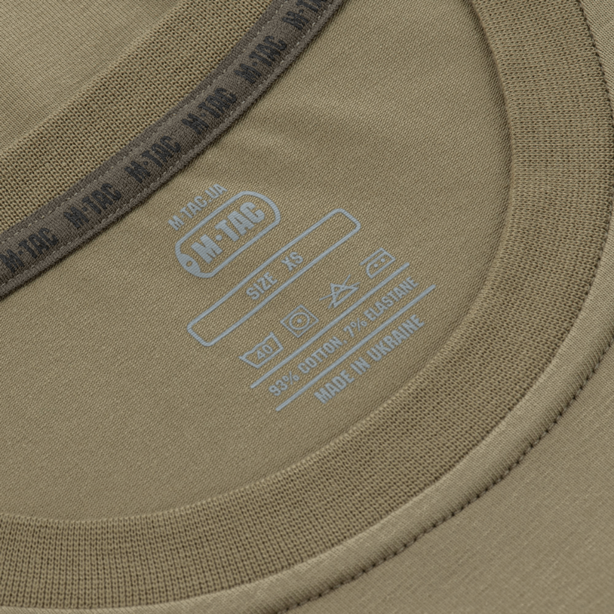 På ryggen ses teksten "M-TAC. Terra Cosaccorum", der henviser til det historiske Cossack-land. T-shirten er lavet i en holdbar bomulds- og elastanblanding, som bevarer form og farve selv efter mange vaske.