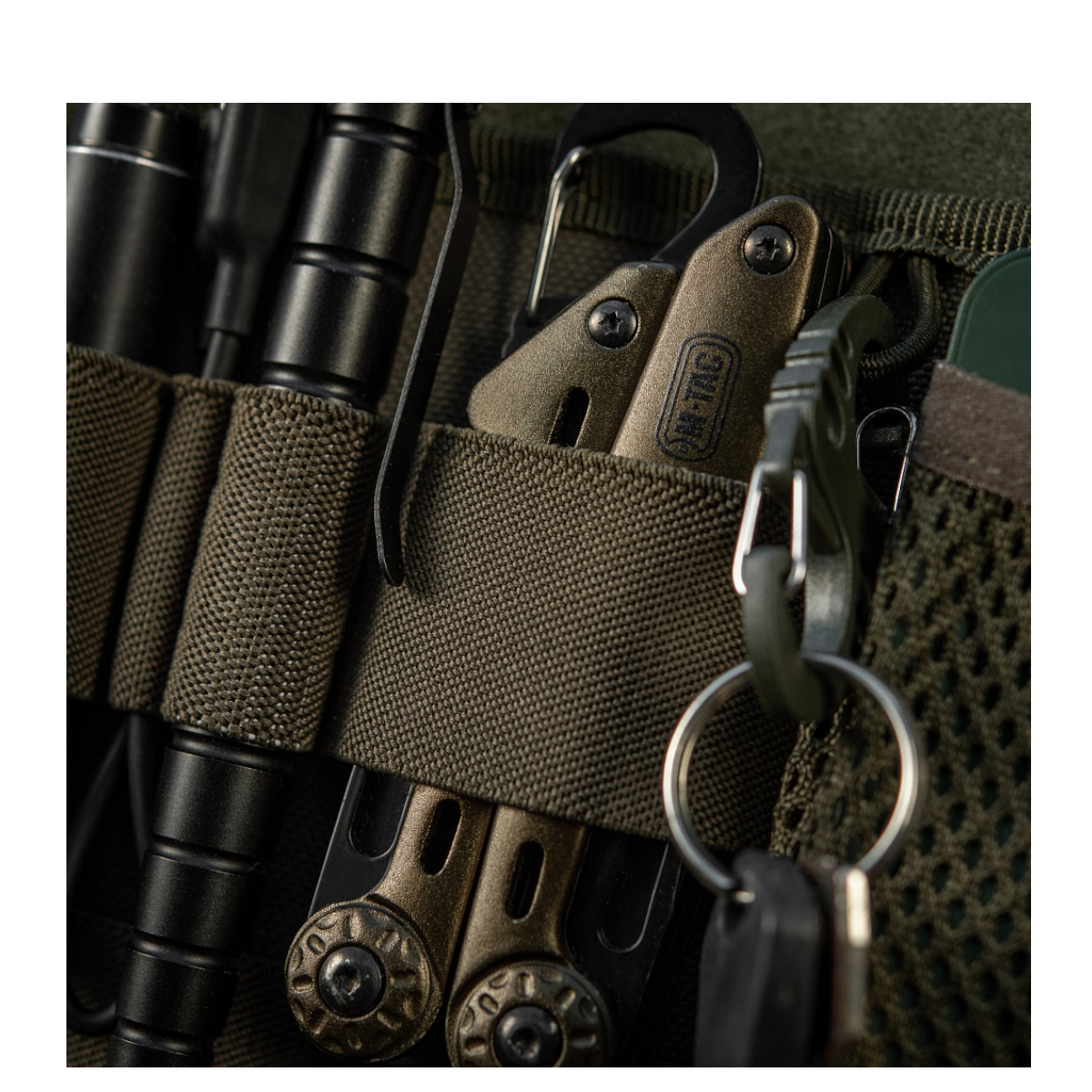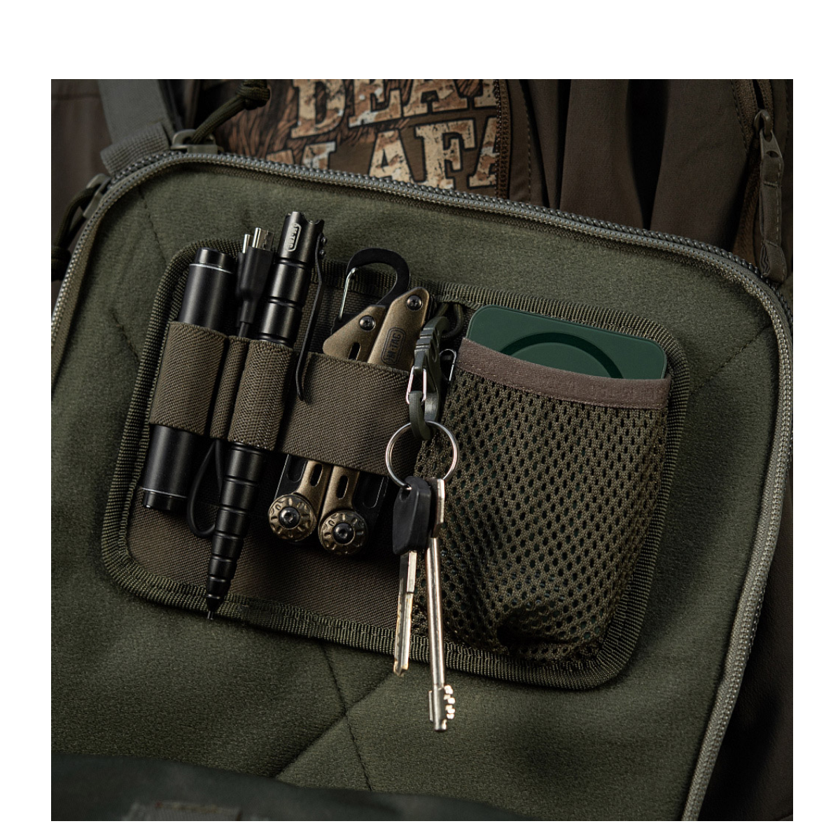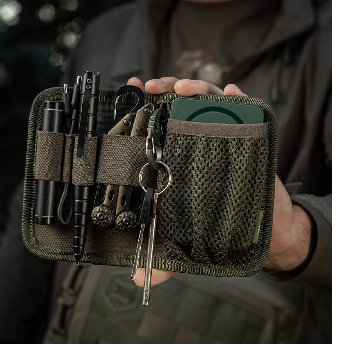 Organizeren er udstyret med elastiske fastgøringer til taktisk pen, lommelygte, nøglekæde, multitool, kniv, telefon og andre nyttige gadgets – ideelt til transport af dit EDC-udstyr. Modulet har også en indbygget nøglering for ekstra funktionalitet.