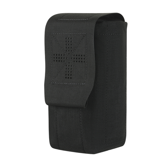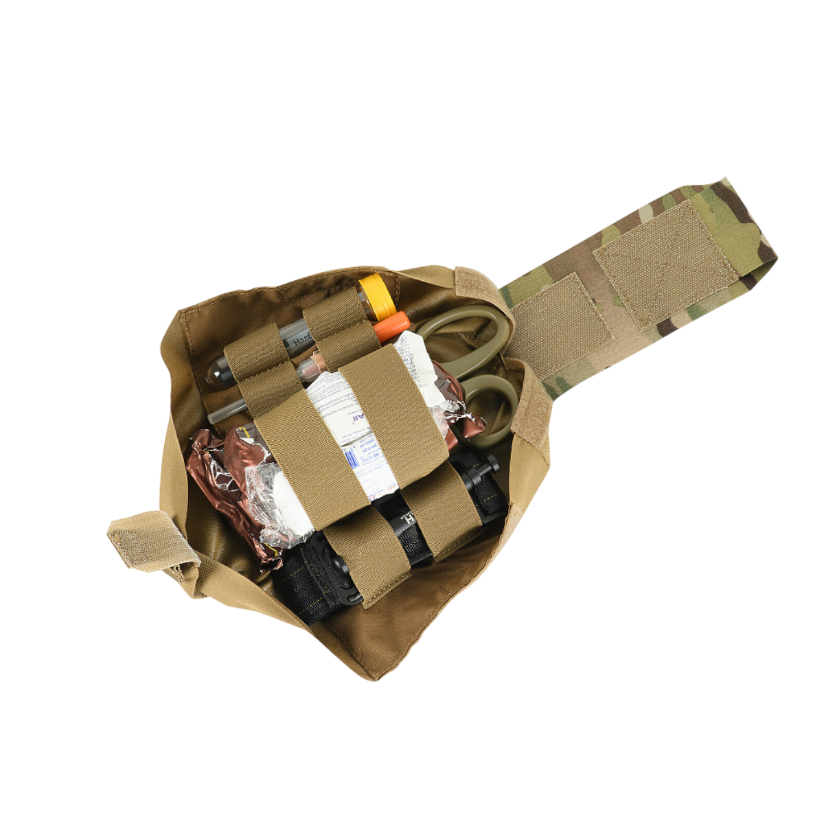 De indvendige sidevægge er lavet af elastisk nylon, hvilket sikrer, at lommen bevarer sin form. Et yderligere fikseringselement er en rem, som gør det muligt at holde førstehjælpssættet sikkert, selv under aktive bevægelser. Lommen fastgøres til udstyr via MOLLE-interfacet, fremstillet med Laser Cut-teknologi.
