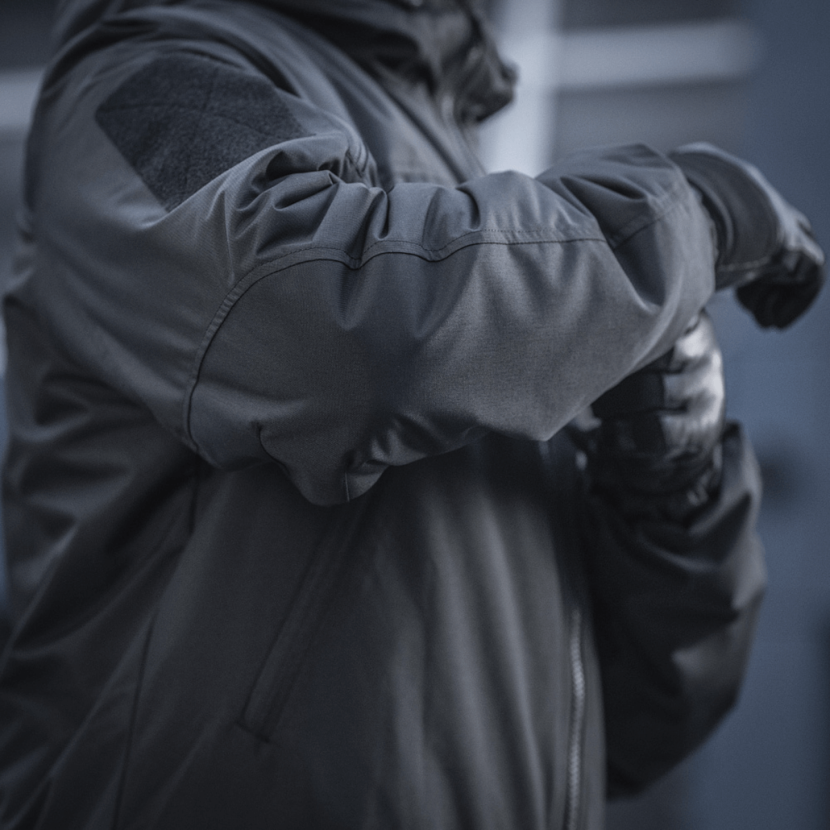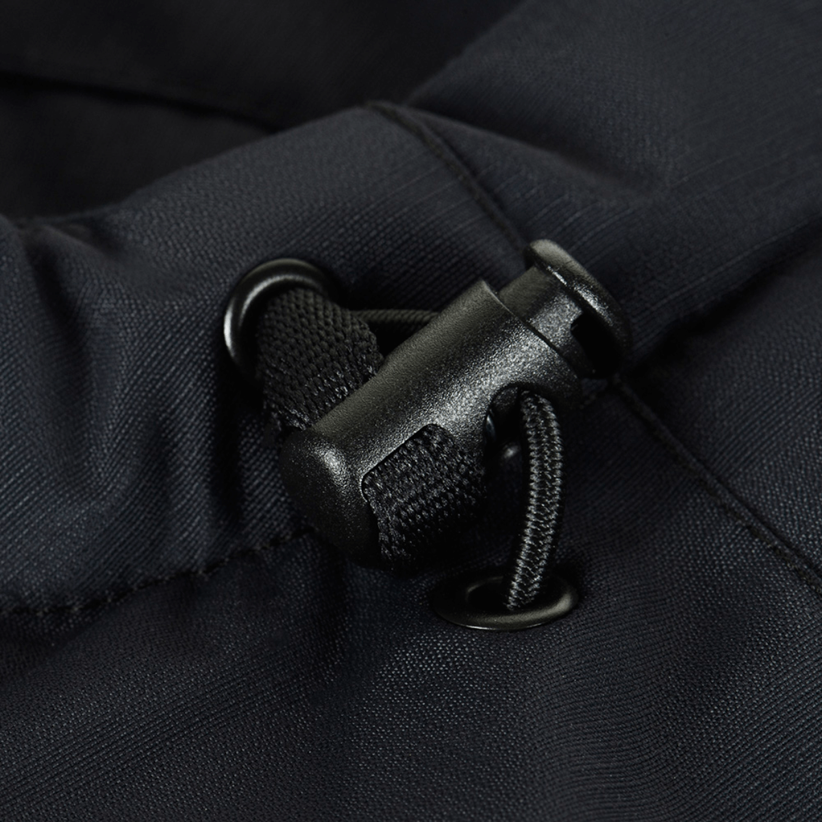 - Fastsydd justerbar hette og elastiske mansjetter