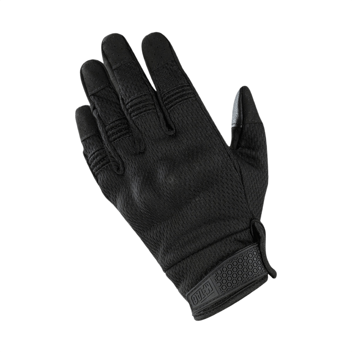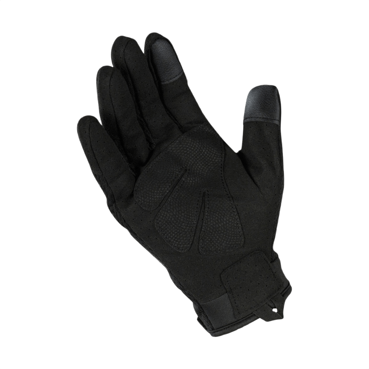 Håndflaten og innsiden av fingrene er laget av myk mikrofiber, mens utsiden består av slitesterkt og pustende nettstoff. Forsterket PVC-polstring på knokene demper støt.