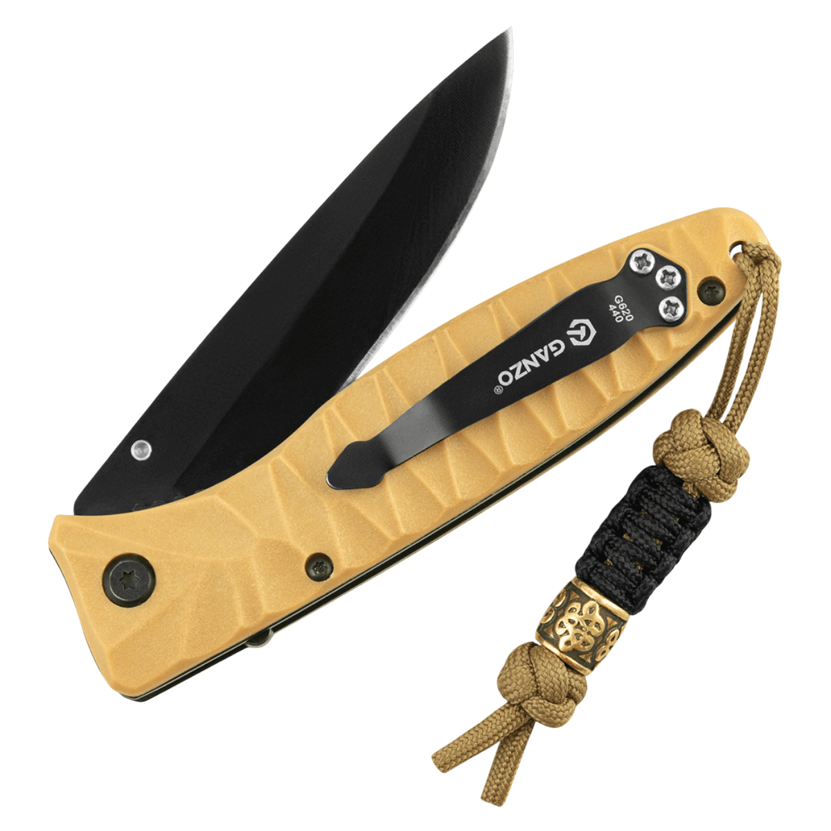 Den gjør det lettere å ta en kniv opp av lommen eller finne den blant utstyr. En dekorativ perle med skandinaviske motiver gir et spesielt preg.