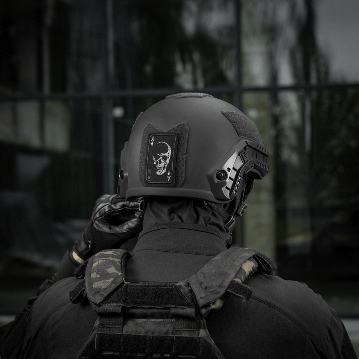 M-Tac Face of War-merke i brodert Cordura 500D. Inspirert av «døds-kortet» fra Vietnamkrigen med et fryktløst hodeskallesymbol.